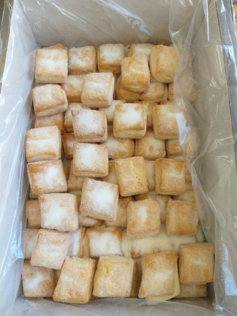 Se hace la masa con harina, agua, sal y levadura. Cuando este proceso está casi terminado se añade la manteca. La masa se deja fermentar durante una hora. A continuación, se corta en cuadrados y se introduce en el horno.
